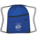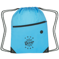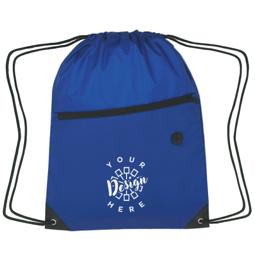 Constructed from durable 210D polyester, this bag features a large front zippered pocket and a built-in slot for earbuds. It is designed with a drawstring closure and reinforced eyelets for added durability.